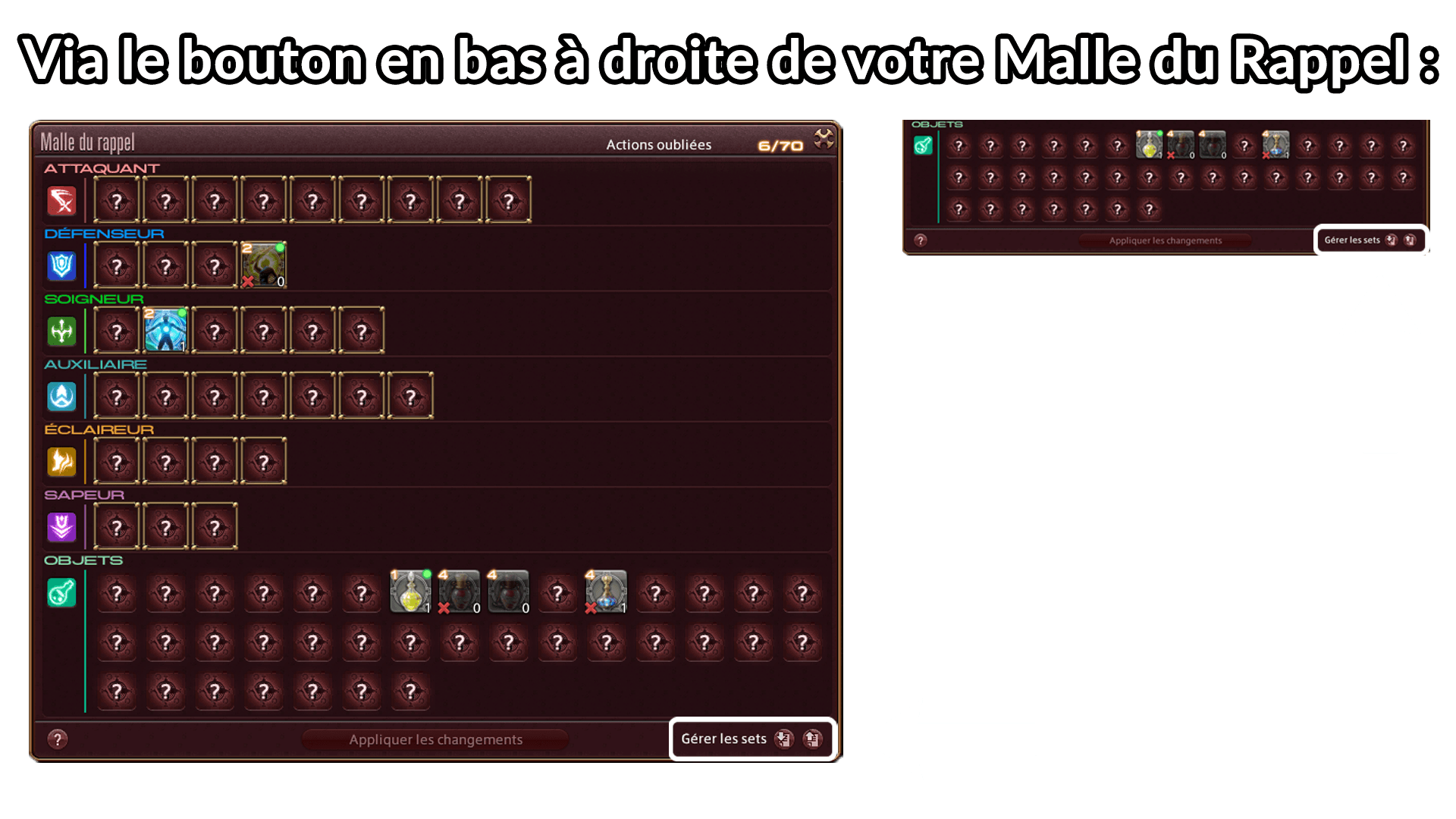 Les objets peuvent être glissés de votre mémento sur vos barres d'actions. Utilisez cette astuce pour rendre votre vie plus facile ! Attention : certains objets partagent le même temps de recharge que d'autres